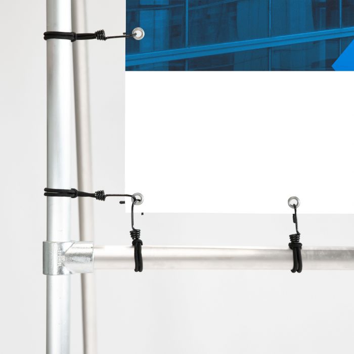 Montage is eenvoudig: je bevestigt het doek in het frame met elastische spanners. Dit zorgt ervoor dat het doek ook bij wind strak gespannen blijft en de boodschap goed blijft staan.