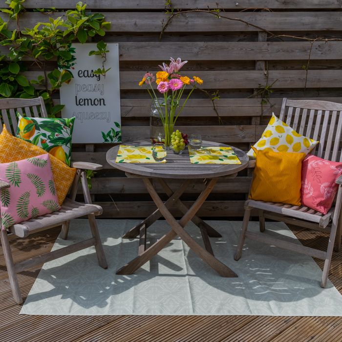 Met het Buitenkleed maak je van je buitenruimte direct een uitnodigende en gezellige plek. Dit kleed wordt geprint op duurzaam materiaal met pigmentinkten, waardoor kleuren helder en intens blijven én het kleed waterafstotend is. Het kleed is licht van gewicht, opvouwbaar en volledig recyclebaar. Dankzij de dubbele zoom is de afwerking netjes en robuust. Dankzij de waterafstotende eigenschappen blijft het kleed geschikt voor buiten.